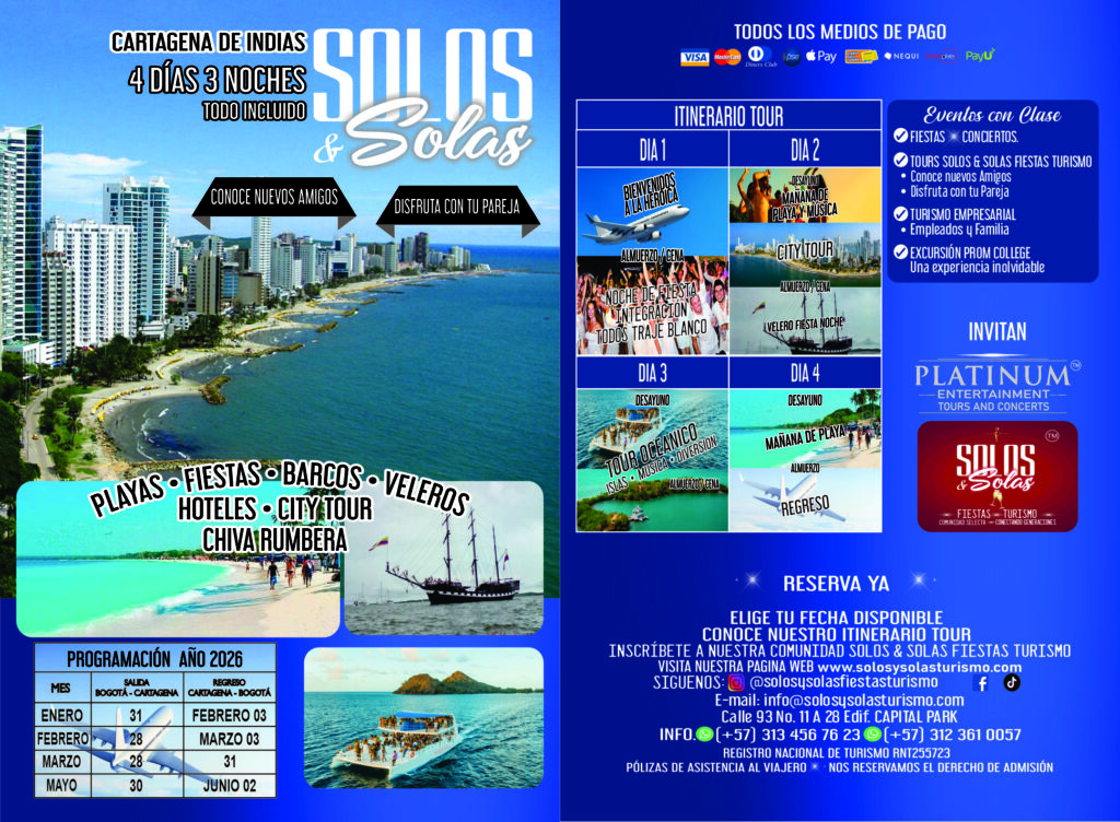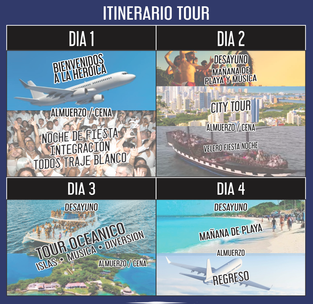 Disfruta un ITINERARIO TOUR diseñado para que vivas lo mejor de Cartagena: City Tour, Playas Paradisíacas, Paseos en Barcos y Veleros. Fiestas, Gastronomía y Nuevos Amigos en cada experiencia